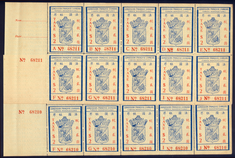 Concession Francaise Changhai Tabacs Manufactures, $2 tax revenues, two sheets of 10, unused, rare.