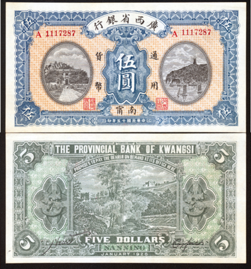 1926 The Provincial Bank of Kwangsi Five Dollars Nanning, UNC.