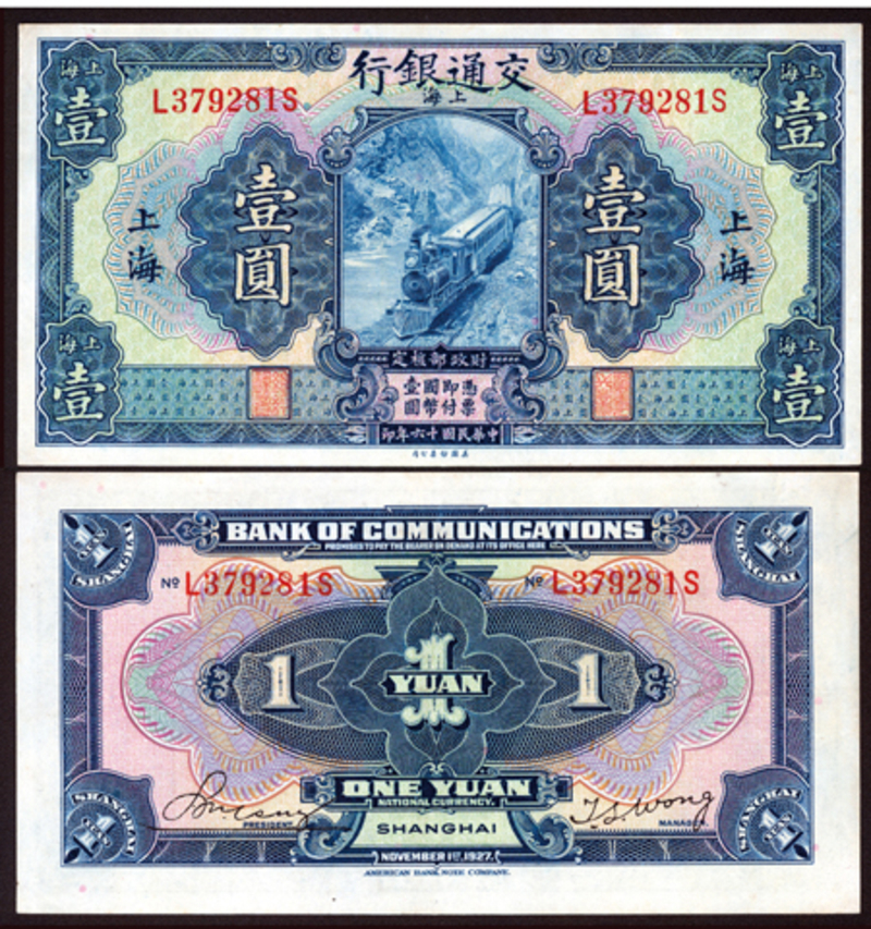 1927 Bank of Communications 1 Yuan Shanghai, UNC.