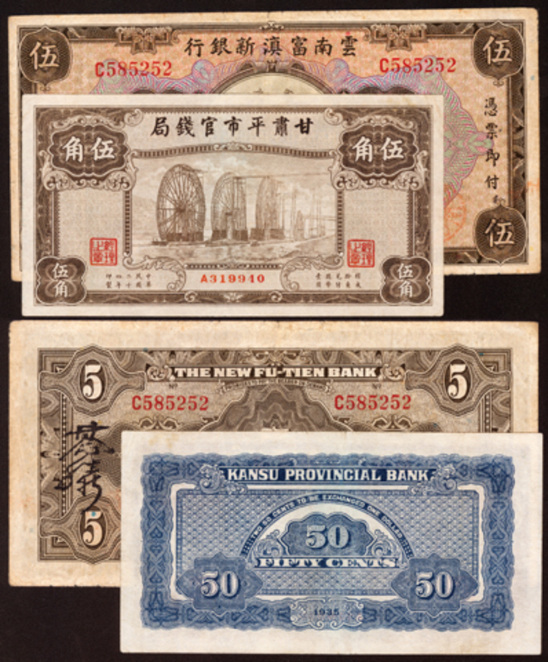 1929 The New Fu-Tien Bank $5 & 1935 Kansu Provincial Bank 50c, XF-AU (2).