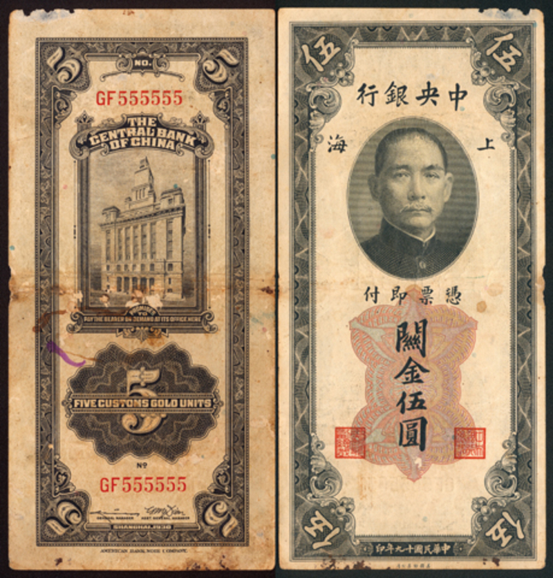 1930 The Central Bank of China, 5 yuan, serial number GF555555, F-VF.