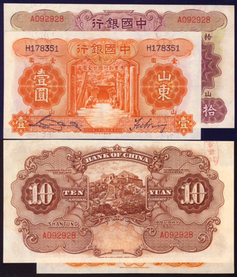 1934-35 Bank of China Shantung, 1 Yuan (1934) and 10 Yuan (1935), AU-UNC (2).