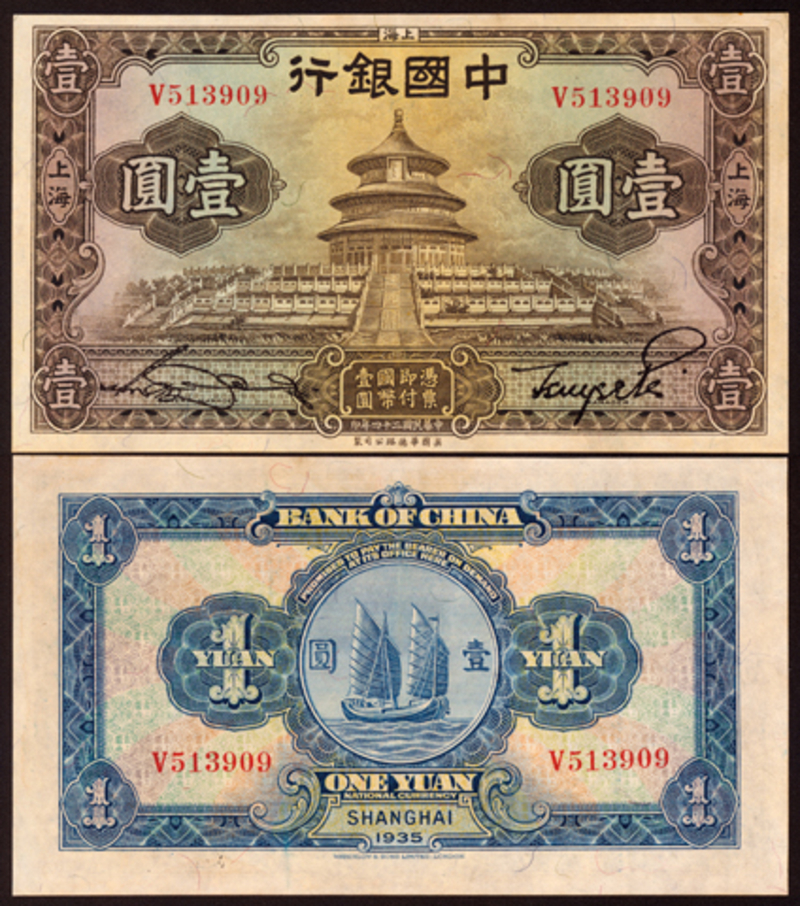 1935 Bank of China 1 Yuan Shanghai, UNC.