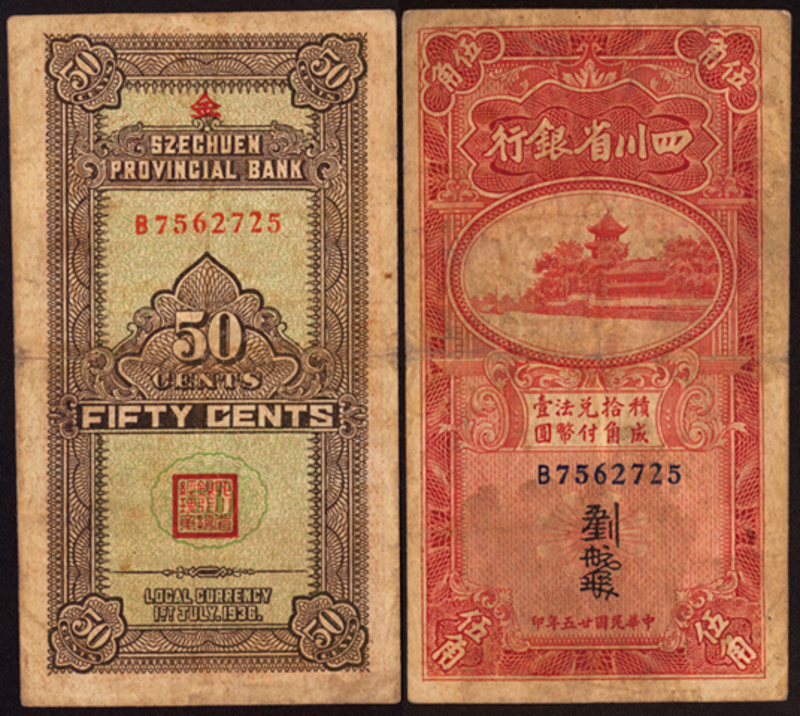 1936 Szechuen Provincial Bank, 50 cents, F-VF.