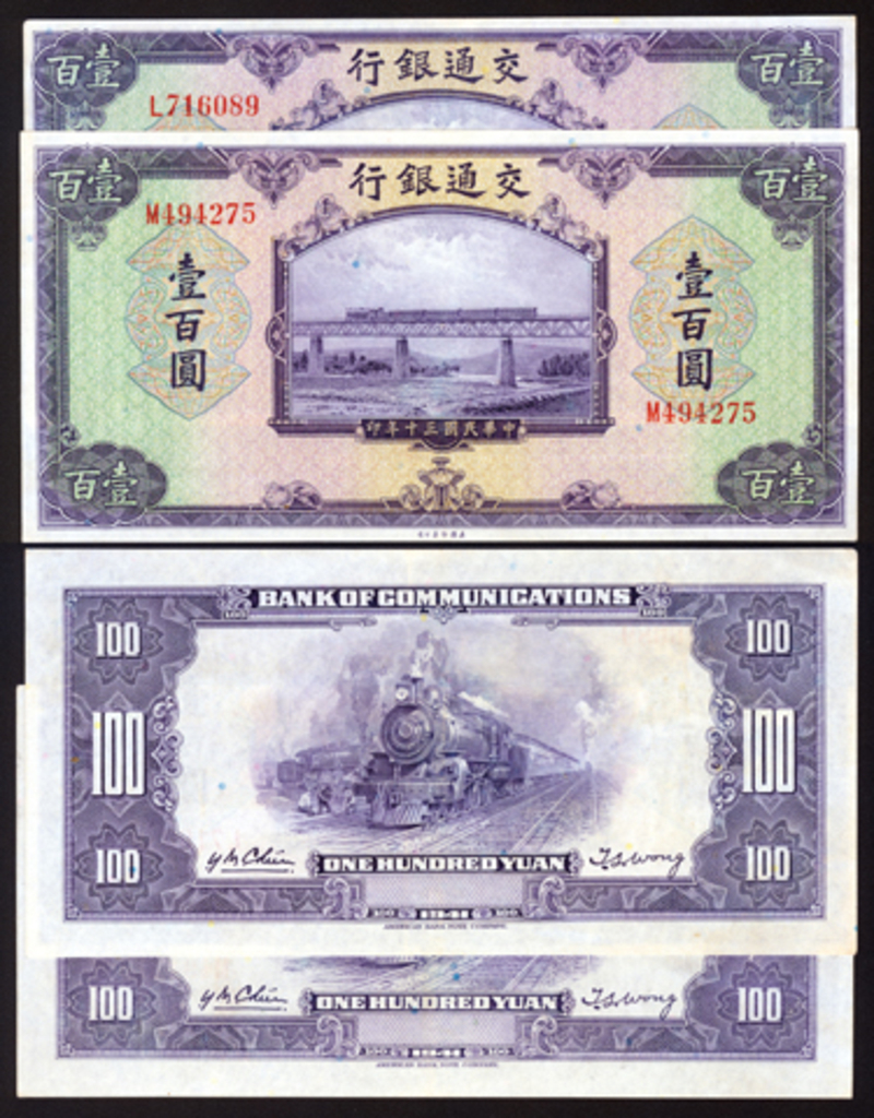 1941 Bank of Communications 100 Yuan, two examples, AU-UNC (2).