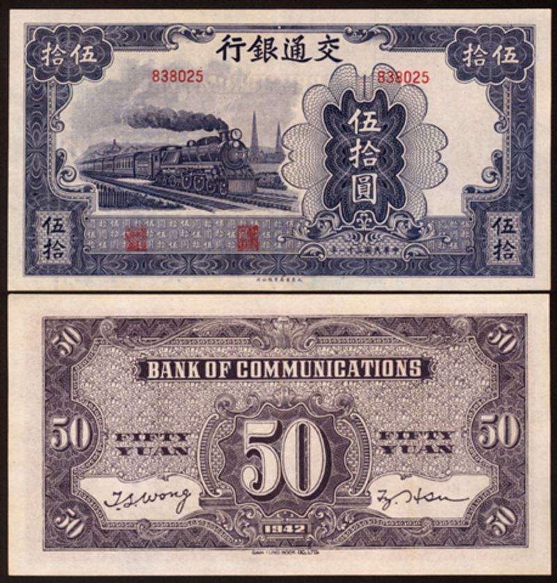 1942 Bank of Communications 50 Yuan, AU-UNC.