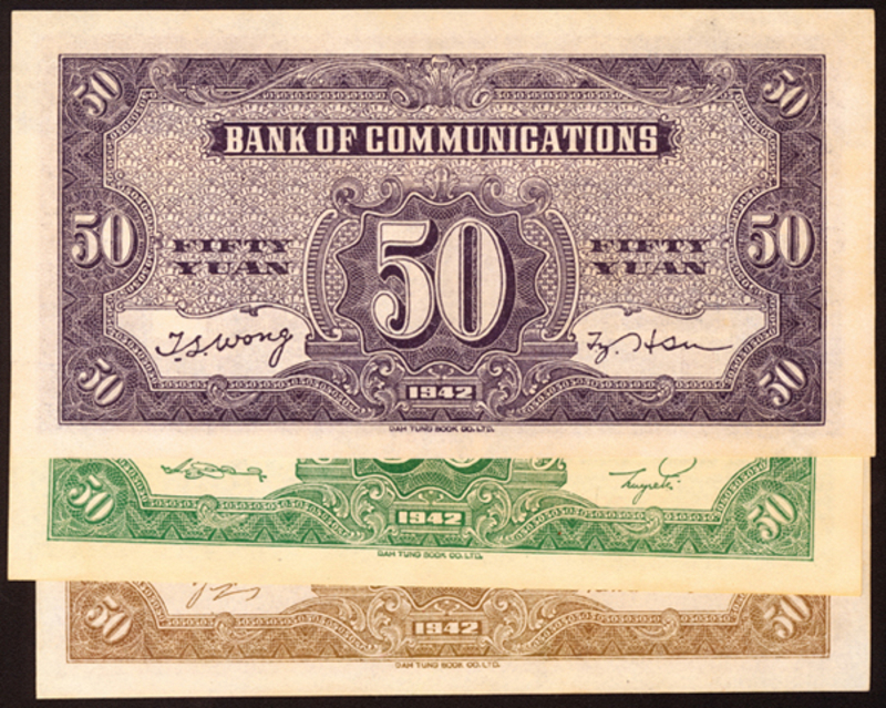 1942 Bank of Communications 50 Yuan, also Bank of China and The Farmers Bank of China, three differrent color examples, UNC (3).