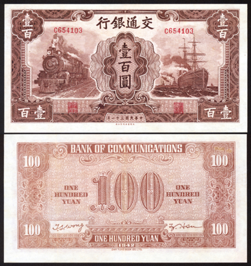 1942 Bank of Communications 100 Yuan, AU-UNC.
