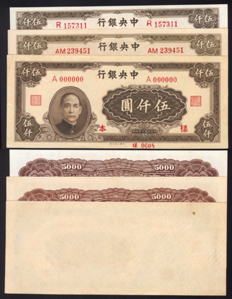 1945 The Central Bank of China 5000 Yuan, Da Ye Print, two examples and a specimen, all UNC (3).