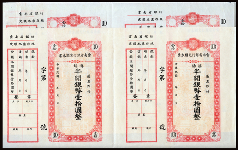 Yunnan Provincial Bank Cashier's Check, group of two uncut examples, two four checks, AU-UNC (4).
