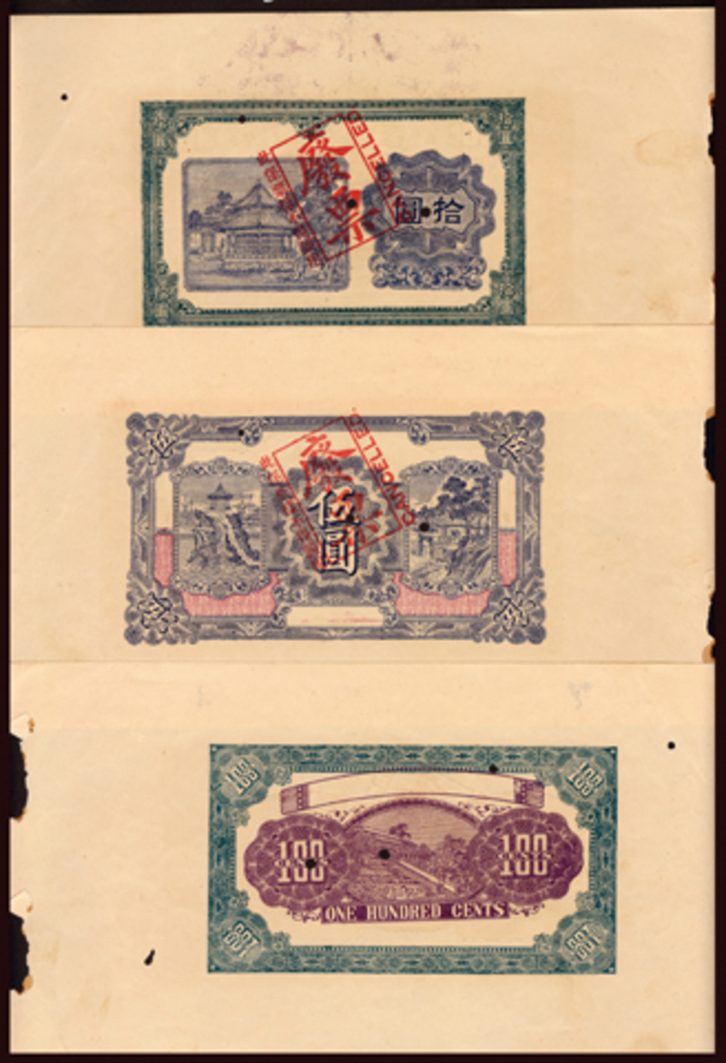 Republic Period Specimen, group of three, each bearing two security punch holes and bilingual "CANCELLED" handstamp in red, AU (3).