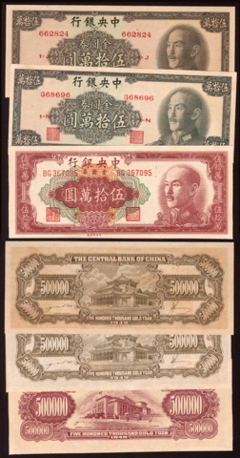 1949 The Central Bank of China 500000 Gold Yuan, printed in three different colors, AU-UNC (3).