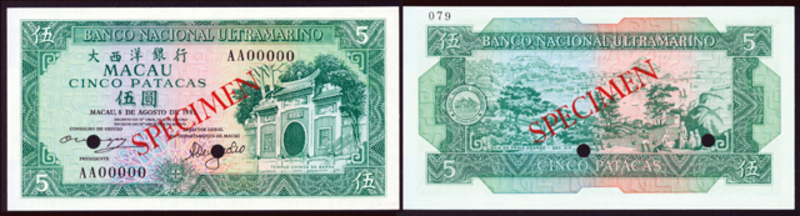Macau Banknotes, Banco Nacional Ultramarino 5 patacas, with diagonal "Specimen" overprint in red, UNC.