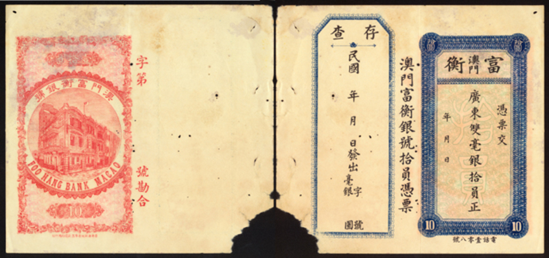 Macau Banknotes, Foo Hang Bank Macao $10, a scarce example complete with tab, unused.