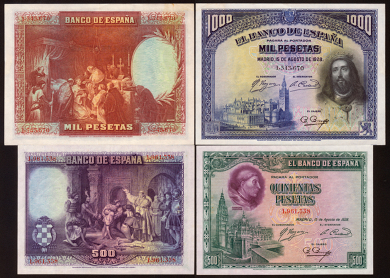 World-wide Banknotes, 1928 El Banco de Espana, 500 & 1000 pesetas, AU (2).