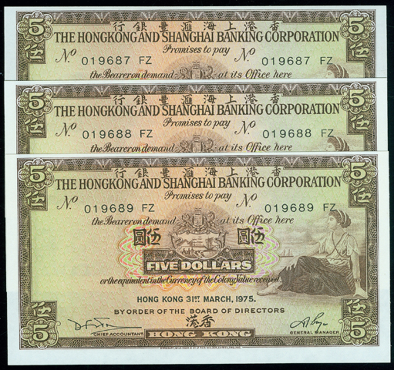 Hong Kong Banknotes, 1975 (March 31) The Hongkong and Shanghai Banking Corporation $5 (Ma H10), group of three with consecutive serial nubmers, miscut with design shifted upward variety, scarce, UNC (3).