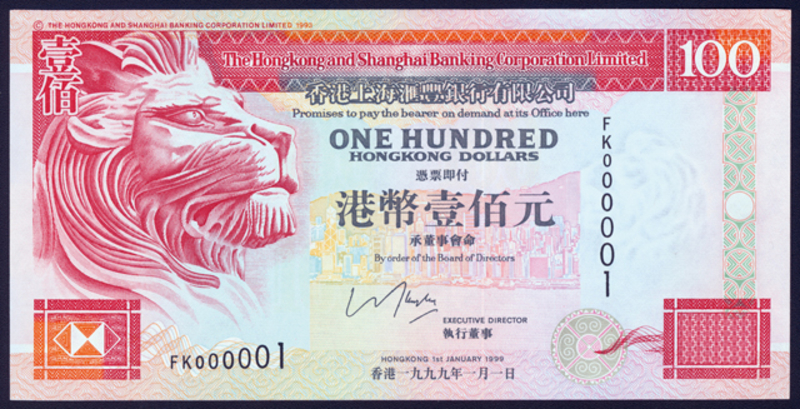 Hong Kong Banknotes, 1999 (January 1) The Hongkong and Shanghai Banking Corporation Limited $100 (Ma H37), serial number FK000001, UNC.
