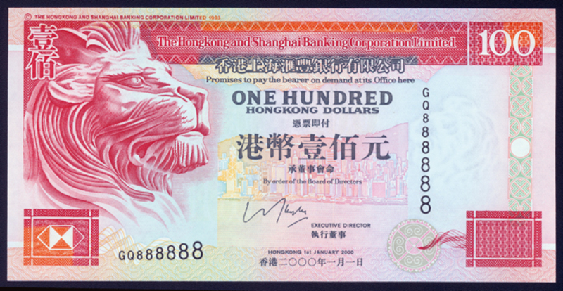 Hong Kong Banknotes, 2000 (January 1) The Hongkong and Shanghai Banking Corporation Limited $100 (Ma H37), serial number GQ888888, UNC.