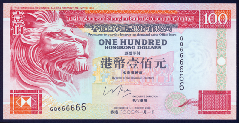 Hong Kong Banknotes, 2000 (January 1) The Hongkong and Shanghai Banking Corporation Limited $100 (Ma H37), serial number GQ666666, UNC.