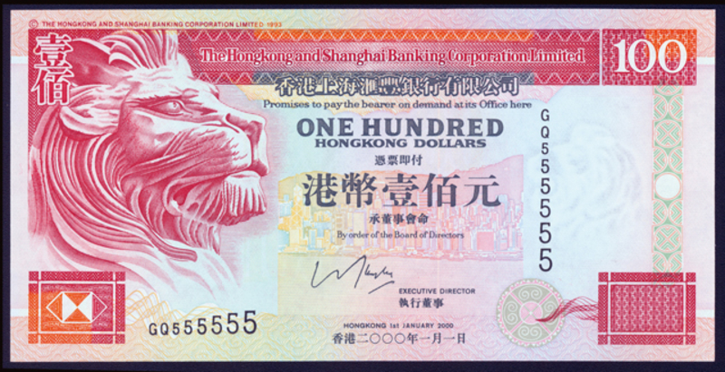 Hong Kong Banknotes, 2000 (January 1) The Hongkong and Shanghai Banking Corporation Limited $100 (Ma H37), serial GQ555555, UNC.