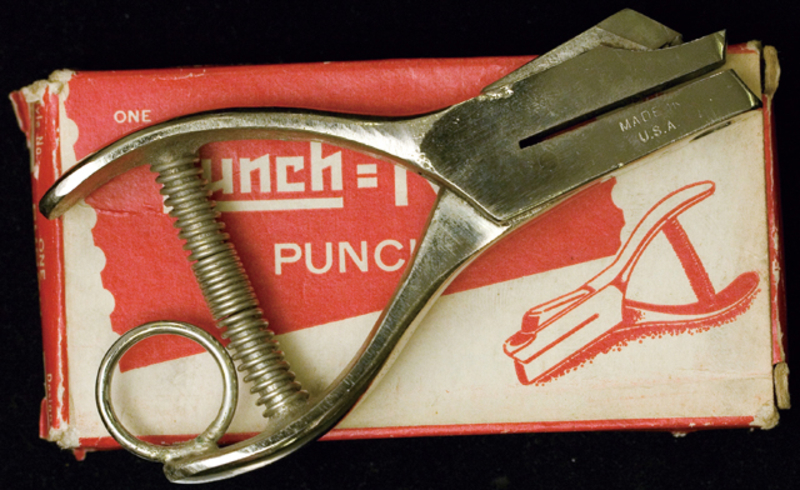A Punch for Every Purpose, original stainless steel bus ticket punch, manufactured by P J Mieth Mfg Company in Point Pleasant, NJ, USA, complete with carton box packaging, very scarce.
