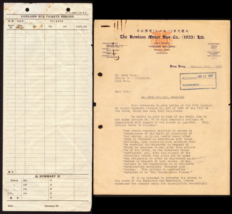 1937 (January 19) Original Correspondence to Banque de L'Indochine, a 2-page letter relating to transfer of shares, signed by Secretary Lam Ming Fan, very scarce early example, also a blank Kowloon Bus Tickets Record form.