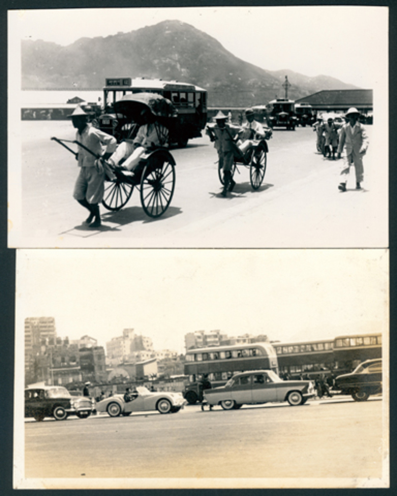Group of Two Black and White Photographs, depicting buses alongside rickshaws in 1930's and vintage automobiles in 1950's.