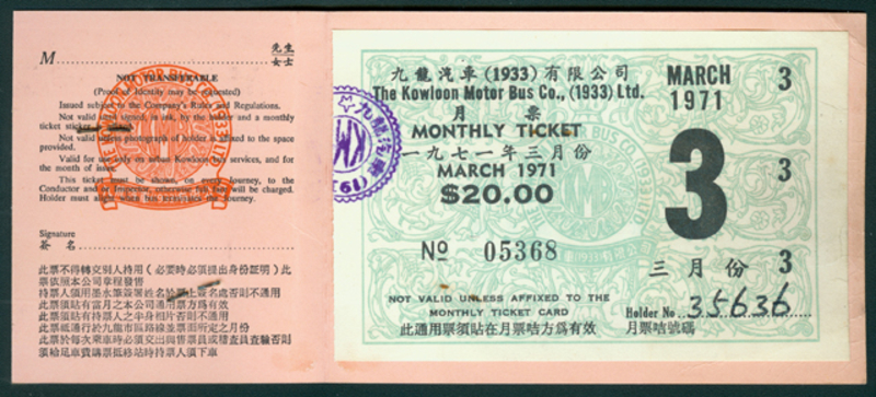 1971 (March) $20 Monthly Ticket serial number 05386, holder number 35636, with photograph of holder.