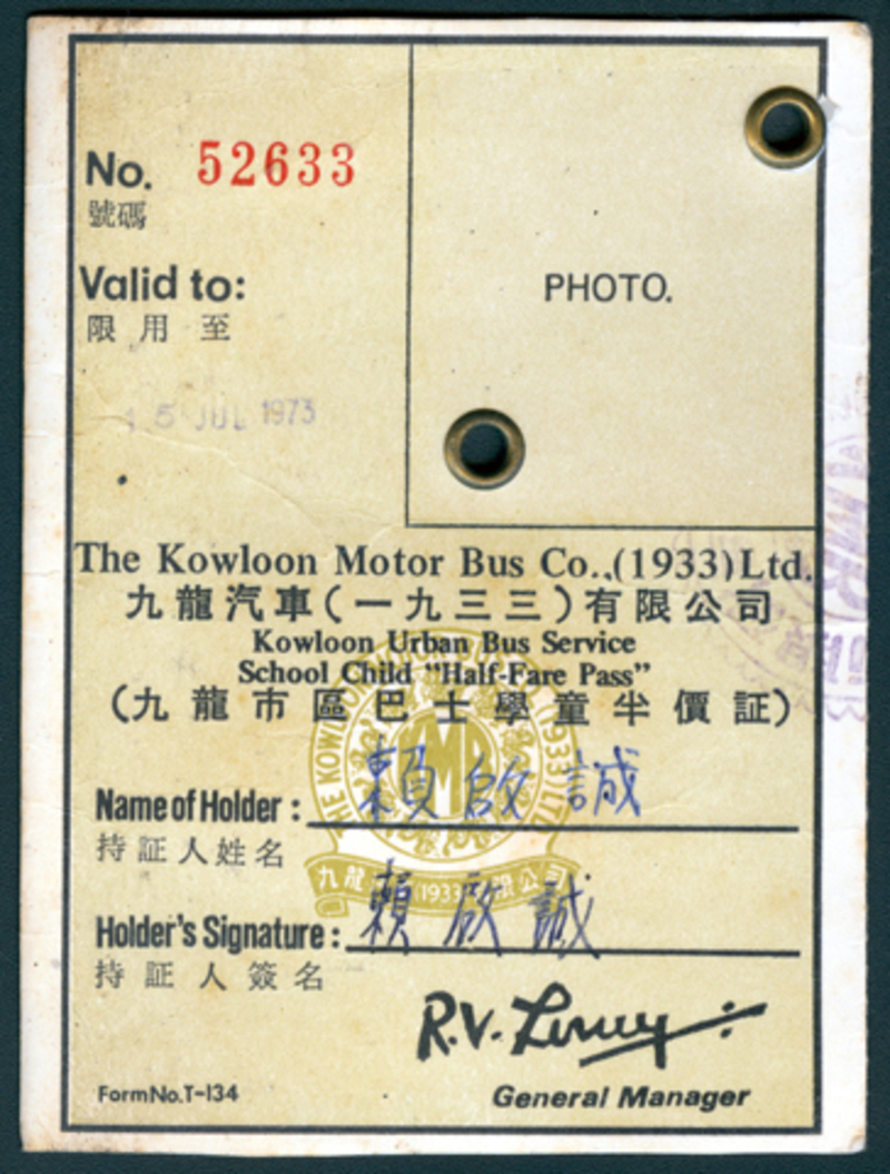 1972 Kowloon Urban Bus Service, Second Child "Half Fare Pass", issued on 26 Sep 1972 and valid until 15 Jul 1973.
