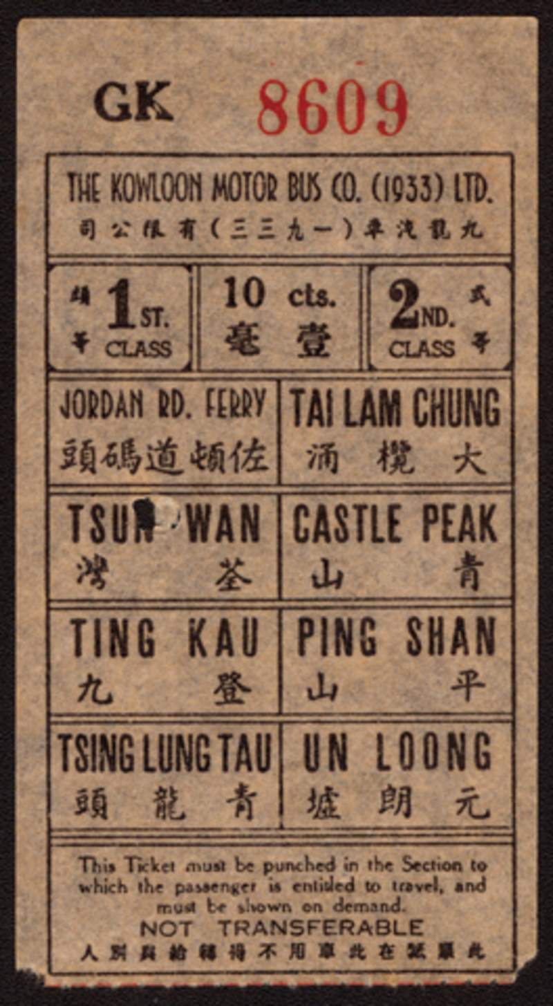 1950's Jordan Road Ferry to Un Long Bus Ticket, early long distance bus route example (thin paper), very fine and scarce.