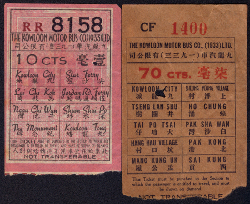 1950's Group of two Bus Tickets, one 10c from Kowloon City to Kowloon Tong, the other 70c from Kowloon City to Sai Kung, scarce.