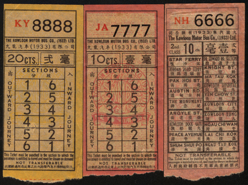 1960's-70's Group of Three Lucky Number Bus Tickets, NH6666, JA7777 & KY8888, very fine and scarce.