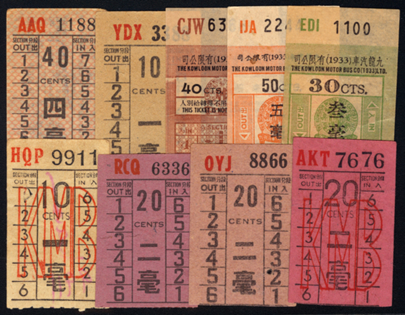 1960's-70's Group of Nine Bus Tickets, including 10c(2), 20c(3), 30c, 40c(2) and 50c, all with good numbers, rare group.
