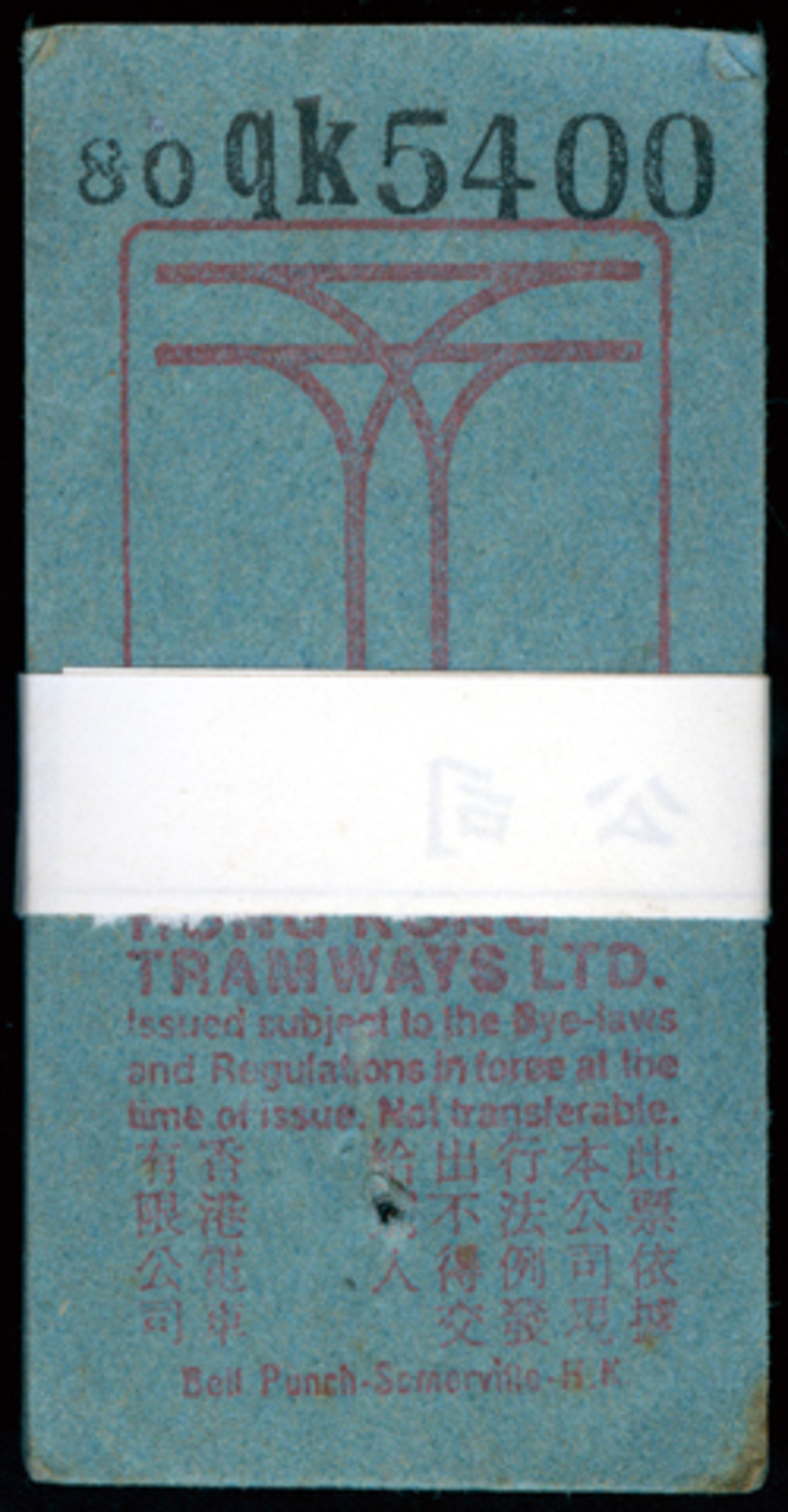Old 10c Hong Kong Tramways Ltd Tickets, printed in black and red on bluish paper, complete pack of 100, serial number 80qk5400 to 5499, scarce.