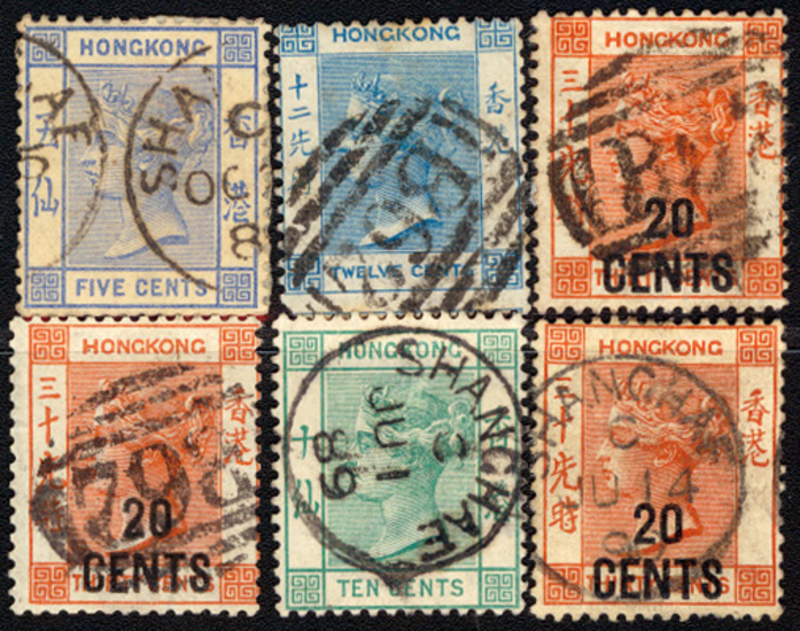 Group of 6 QV Issues, used, three with "B62" obliterator and three with Shanghai BPO cds.