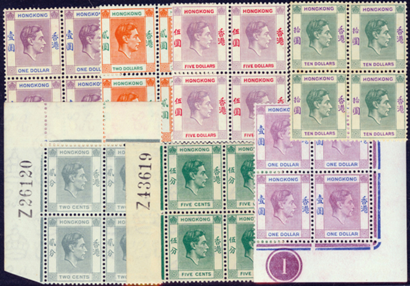 1938 KGVI First Issue (Yang 134-146), complete set of 13 in blocks of four, 4c in block of six and extra $1 block of four, seven corner blocks, two with acquisition number and one with plate number, gum toning on 10c, $1, $5 & $10, scarce.
