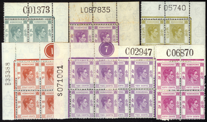 1938-1946 KGVI Definitives, group of seven blocks of four with requisition numbers, including 2c, 8c, 10c(3, one block toned), 25c & 50c, UM.