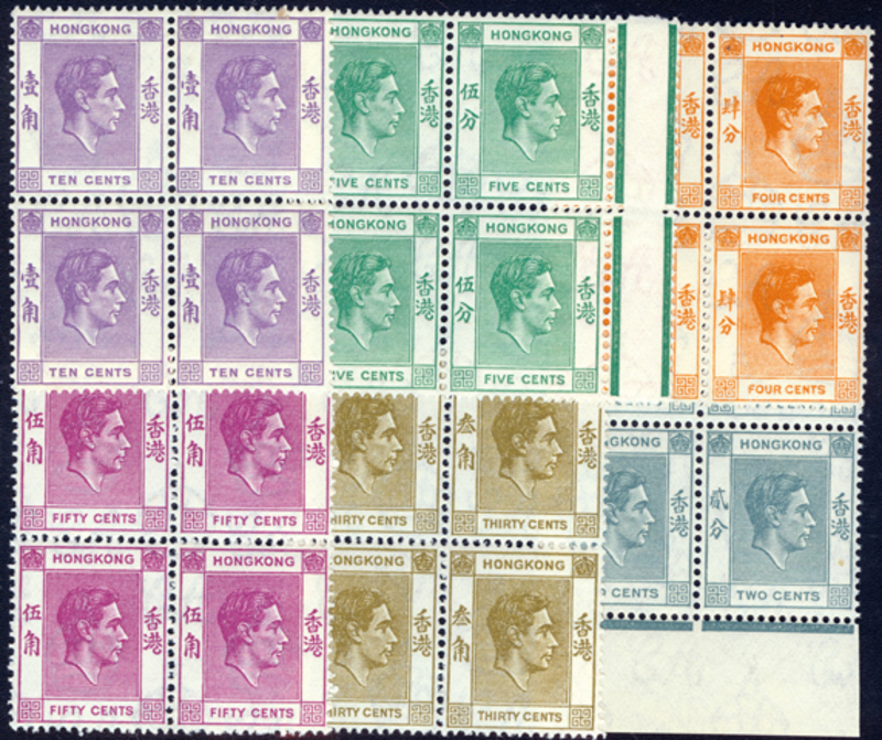 1941-46 KGVI Second Issue (Yang 147-152), complete rough paper set of 6 in blocks of four, UM.