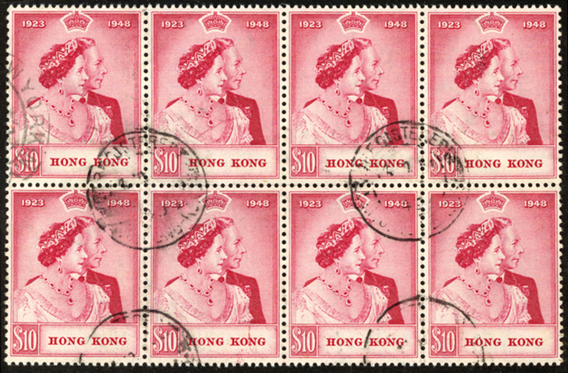 1948 (December 22) KGVI Silver Wedding 10c (Yang C18), used block of 8, scarce multiple.