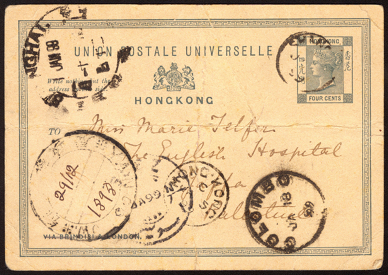 1898 (December 29) QV 4c Postal Card from Yangchow to Palestine, canceled by Shanghai BPO cds, bearing Yangchow despatch dollar dater with manuscript date 29/12/1898, Shanghai transit dollar dater alongside with Hong Kong, Colombo and Suez transit cds, vertical and horizontal folding creases, very rare destination and believed to be the earliest known Yangchow dollar dater usage.