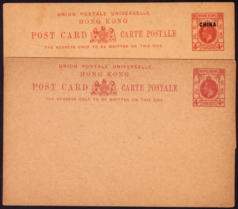 1912 KGV 4c Carmine Postal Card (Yang 28) & 1916-18 KGV "China" 4c Carmine Postal Card (Yang P35), both unused.