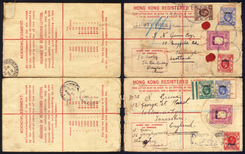 1917 (May 14) KGV "China" 10c Registered Envelope (Yang G49) to England, size 3.75" x 6", up-rated with KGV "China" 2c, 4c & 10c, all tied by oval Registered Shanghai BPO datestamp, rough opening at left, also 1922 example to Scotland up-rated with 1c, 4c & 10c, opened at right, both fine (2).