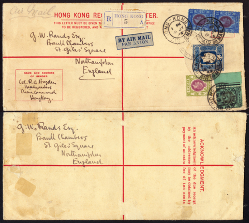 1934 (July 16) KGV 20c Registered Envelope (Yang H44) to England, size 5" x 8", up-rated with 20c, 50c & vertical pair of $1, tied by Hong Kong Air (R) Mail cds, scarce.