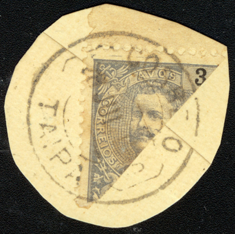 1903 Carlos Bisected 3a Slate (Choi 130b), used on piece tied by double ring "Correio/Taipa" cds.