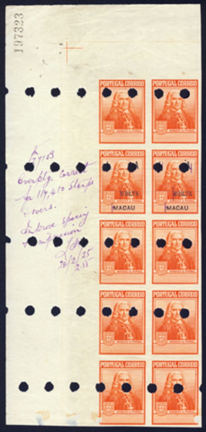 1925 "4A MULTA" Overprint on Marquis Issue (SG D331var), printer's archive proofs, top left margin corner block of ten on unwatermarked paper and no gum, with control number and bearing usual punch holes, only second horizontal pair from top with black overprints, manuscript date with instruction at left margin, lightly creased (10).