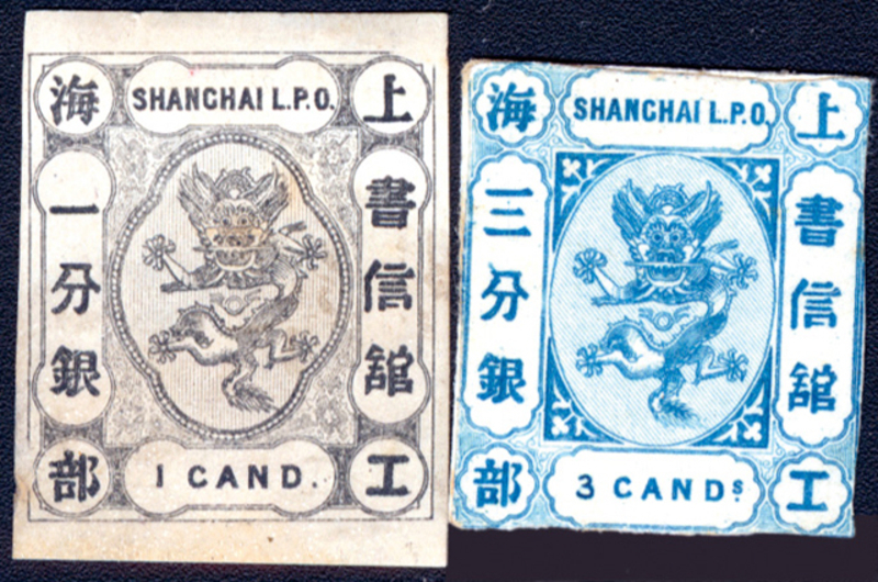 1867 LPO Shanghai Small Dragon Die Proofs, 1ca Black on thin paper and 3ca Prussian blue on white card (2).