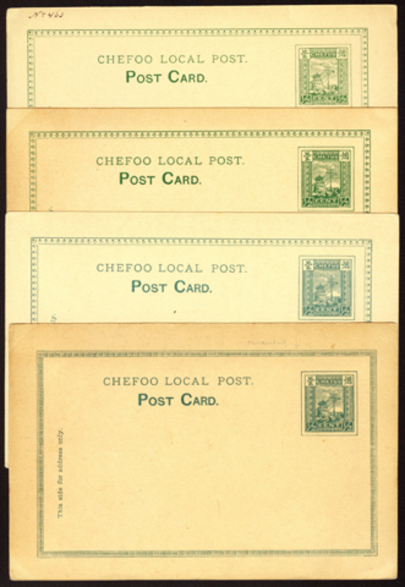 1894 Smoke Tower Design Set of Postal Cards (Livingston PC1a-4), complete group of four, including the scarce small spirals border, all fine unused and clean (4).
