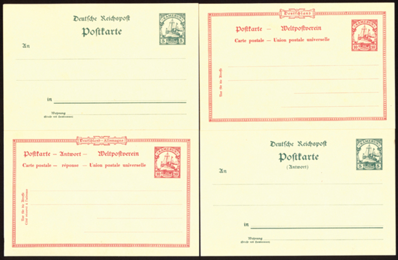 CAMEROONS: 1900 Kamerun Postal Cards (H&G 8-11), group of 4, including 5pf Green, 10pf Carmine, another two examples with reply portions (unfolded), all fine unused and clean (4).