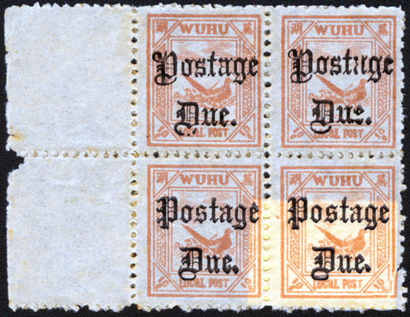 1895 "Postage Due" Overprint First Issue, 2nd Printing, perforation 11, 10c Lake-brown (SG D39 a & ab), left margin block of four, top pair with type I & II overprints, bottom pair with scarce type III overprint, top right stamp also with broken "a" & "e" variety, bottom right corner torn, UM (4).