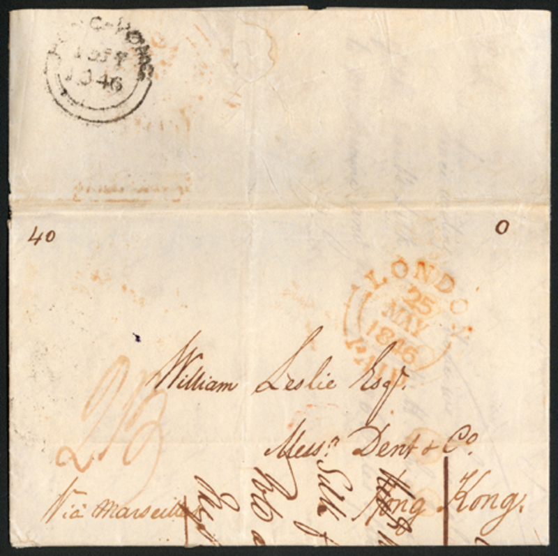 1846 (May 25) Entire from United Kingdom via Marseilles to Hong Kong, manuscript "2/3" rate marking, London Paid double arc datestamp alongside, Hong Kong double arc receiver on reverse.